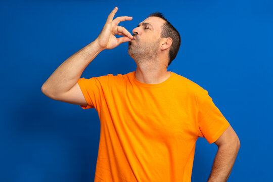 Portrait of a bearded hispanic man in orange t-shirt with puckered lips showing gourmet sign with fingers tasty delicious isolated on vibrant blue color background.