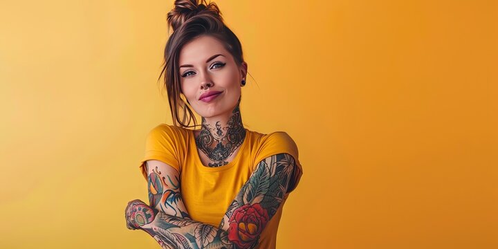 young friendly tattooed woman, stylish, modern, solid background, copy space