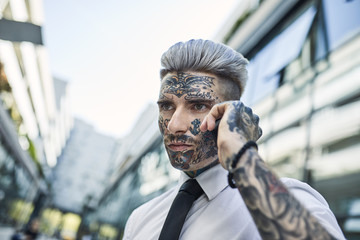 Young businessman with tattooed face, talking on he phone
