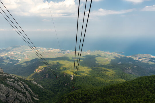 Mountain views from the cable car cabin to the top of Tahtali and the sea near the coast of Kemer, Antalya, Turkey