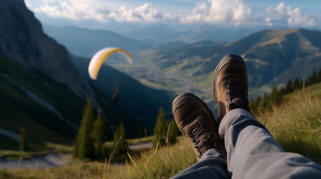 A pilot’s boots at the edge of a grassy alpine launch site, paraglider lines stretched taut toward the rising wing — raw anticipation and cliffside takeoff energy. cinematic color correction,