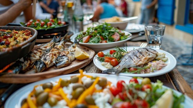 Mediterranean dishes arranged outdoors on a table at a taverna in Southern Europe.