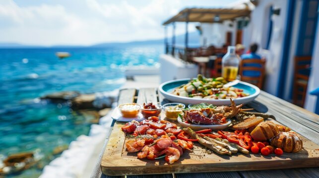A rustic Greek island taverna with a platter of assorted meze, with the sea and whitewashed buildings creating a picturesque backdrop