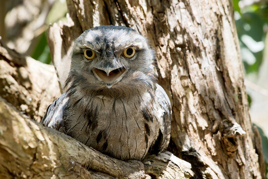 Closeup of a tawny frogmouth on a tree.