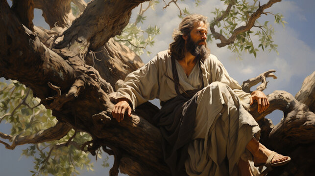 A portrait of Zacchaeus perched in a tree, eager to see Jesus Generative AI