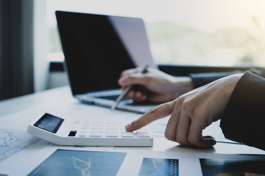 Businesswomen bookkeeper hand use calculator and laptop doing account for paying tax on white desk in working office