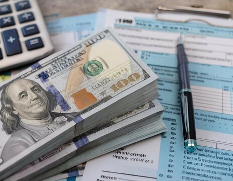 Taxation and financial obligations featuring elements like tax forms, calculators, and money representing responsibility, payments, and finance.