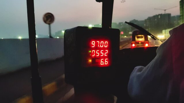 The digital taxi meter on the dashboard of cab shows kilometer and cost. Night taxi ride in traffic jam.