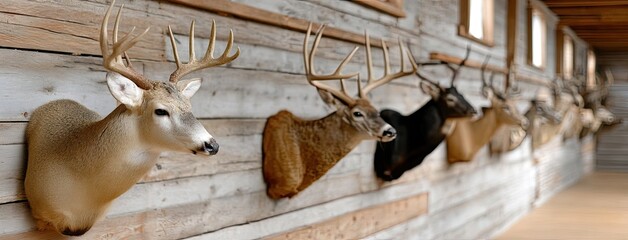 Taxidermy display featuring deer mounts on wooden wall in rustic setting conveying a hunting and nature theme