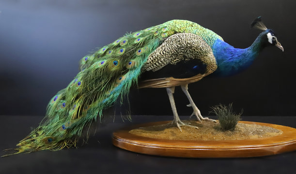 Closeup of a stuffed taxidermy peacock