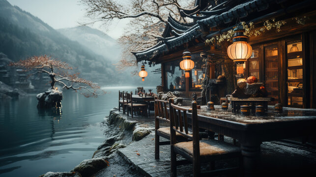 Contemporary Scene Of Chinese Culture Lake Tea House Is Sitting By The Lake Enjoying The Snow Scenery While Drinking Tea by The Charcoal Stove Landscape Background