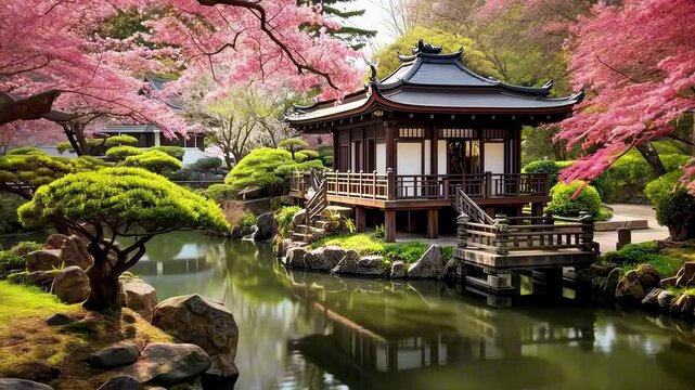 Serene Japanese garden showcasing a traditional tea house amidst blooming cherry trees, reflected in a tranquil pond