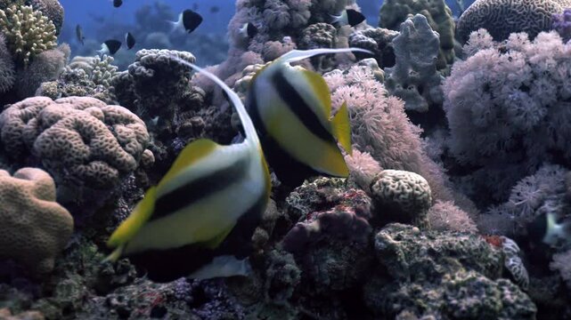 A pair of Red Sea bannerfish (Heniochus intermedius) swimming amongst a rich variety of hard and soft corals.