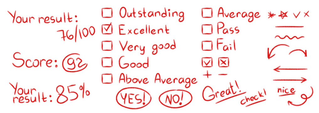 Red pen grade marks and test symbols. Vector Hand drawn school scores from A+ to F, percentages, checkboxes, stars, and comments Excellent and Fail. Doodle exam elements for educational design.