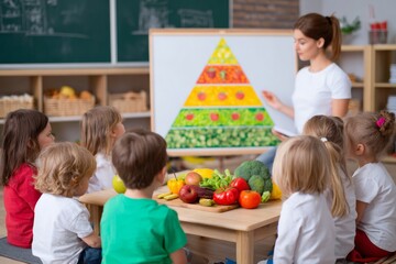 Children attentively learn about healthy eating habits in a bright classroom. A teacher points to a colorful food pyramid chart while fresh fruits and vegetables are on the table