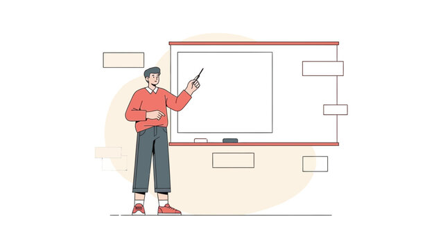 Cartoon Teacher Presenting in Classroom with Whiteboard and Student Desk