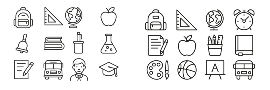 Educational icons representing various school subjects and activities designed for students and teachers in a classroom setting