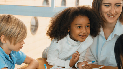 Group of pupil boy girl group study with teacher in classroom at elementary school. Student in primary school story telling. Children  classroom. Education knowledge, success teamwork concept banner