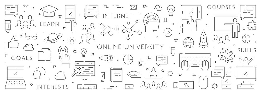 Online education concept for presentation slide template. People learning from video lessons, watch seminars, students training at webinars. Vector illustration with flat persons for layout design