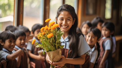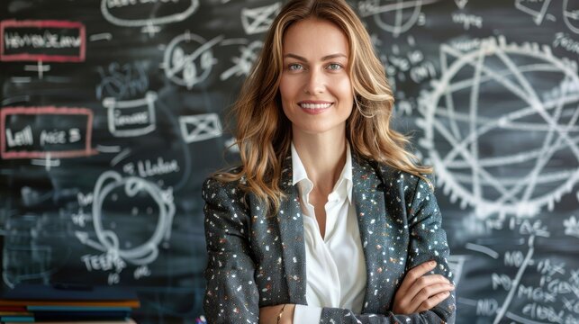 woman university teacher Clean background with a chalkboard, books, and educational props