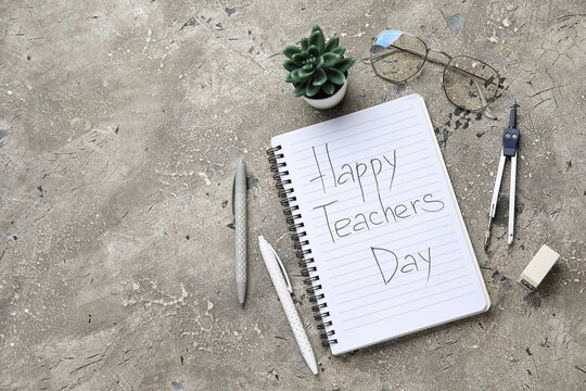 Notebook with text HAPPY TEACHERS DAY, eyeglasses and different stationery on grunge grey background
