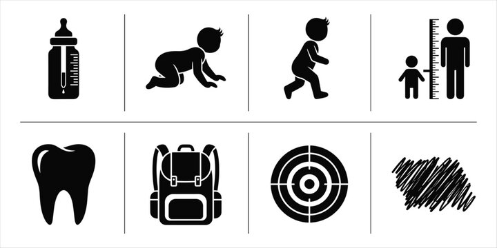 Icons for baby care, growth, education, health, and school on white background bottle milk