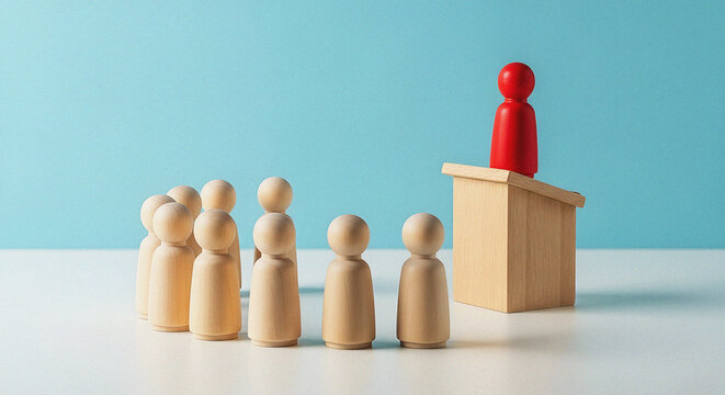 Corporate Public Speaking and Effective Leadership Training Seminar Concept Red Wooden Figure Presenting from a Podium to a Small Group of Listeners