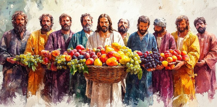 Jesus offering fruits to disciples in colorful watercolor style with vibrant robes and natural setting Generative AI