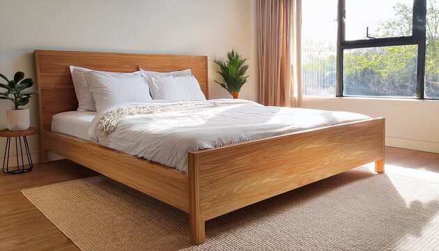 teak wood bed frame with clean lines draped with white linens in a cozy sunlit bedroom teak furniture modern comfort