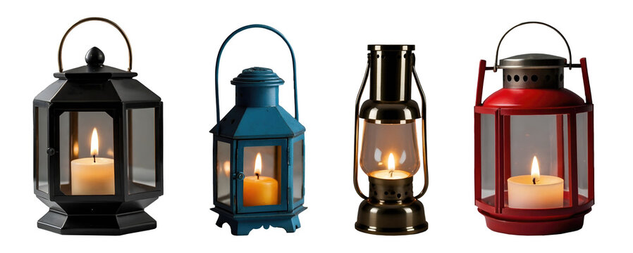 Set of beautiful tealight lantern lamps with burning candles isolated on transparent background. Generative AI