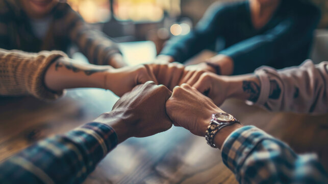 A team of professionals in a meeting showing unity by joining fists together in a circle, symbolizing collaboration and mutual support in a business or work environment.