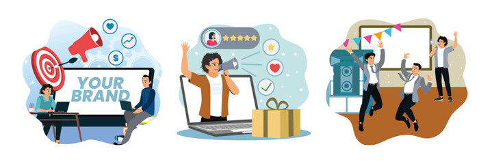 Branding team increases business targets with brand names, promoting positive feedback, brand event.