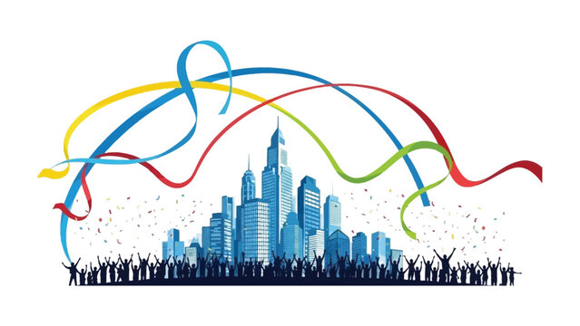 City Skyline Celebration: An uplifting visual of a city skyline is adorned with celebratory ribbons, symbolizing growth, innovation and achievement.
