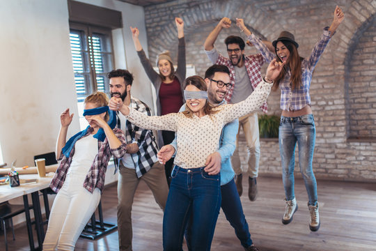 Business people, blindfold and winning with group for team building activity or coordination at office. Employees, excited or fun game with colleagues in celebration for trust or communication skills