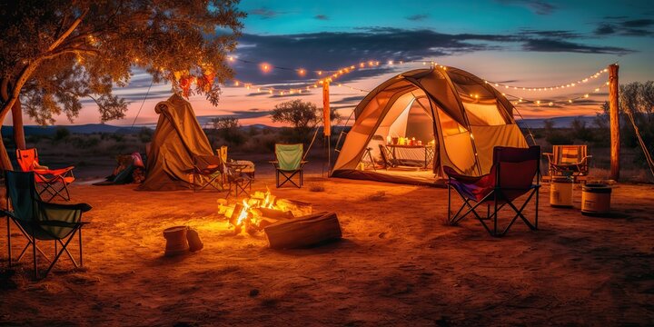 AI Generated. AI Generative. Evening camping party bonfire camp fire. Adventure vacation team bulidng party friends vibe. Graphic Art Illustration