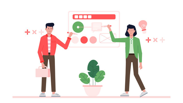 Two people discussing website design, suitable for web design blogs, technology presentations, marketing materials, teamwork concepts, collaborative projects.