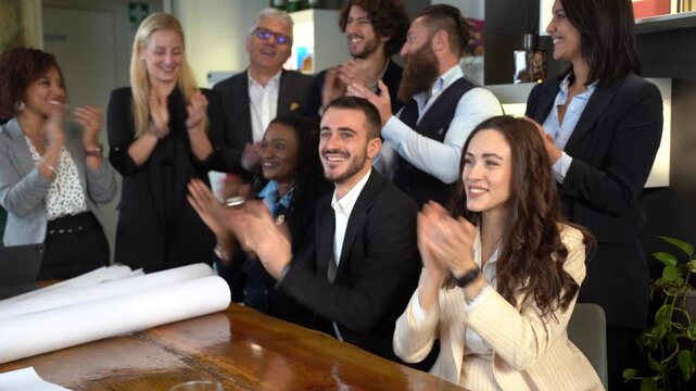 Business team celebrating a major goal with applause and enthusiasm. Corporate colleagues sharing success and motivation in a vibrant and supportive work environment. Emotional leadership teamwork.