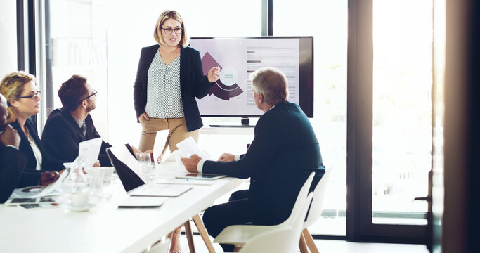Woman, presentation and graphs at meeting in office with monitor, questions and consumer expansion planning. Speaker, screen and business people with charts, stats and strategy for profit increase