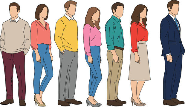 Flat vector illustration of diverse professionals standing in line, business attire, team concept, office fashion, career people, side view