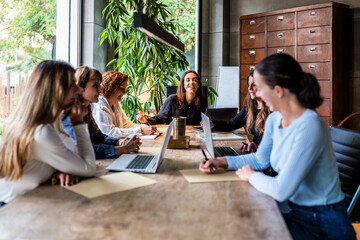 All-female team in collaborative office meeting