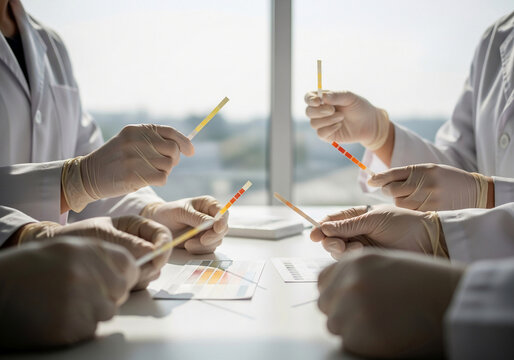 Team of scientists in white coats and gloves analyzing test results in a modern laboratory.