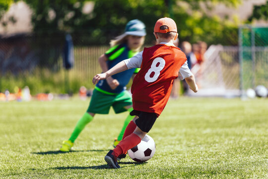 School Children Running Soccer Ball. Children Play Football Game on Sunny Day. Happy Kids Have Fun at Football Pitch