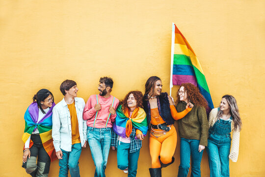 Diverse group of young people celebrating gay pride festival day - Lgbt community concept with guys and girls hugging together outdoors - Multiracial trendy friends standing on a yellow background