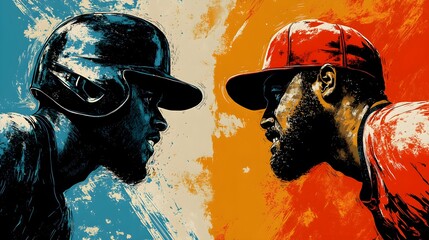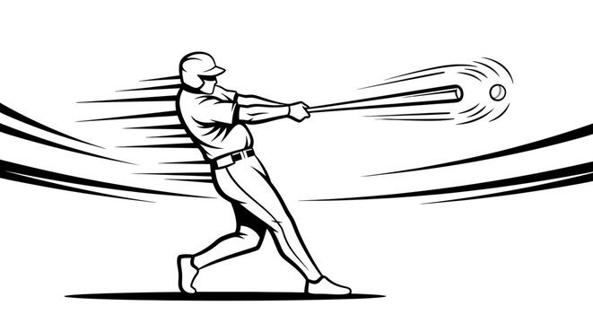 A dynamic black and white illustration of a baseball player swinging a bat at a ball in motion.