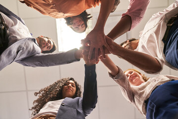 Close up corporate business team people group stack hands together in pile. Close up view building strong reliable team. Helping in teamwork express strength power of partnership professional