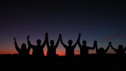 Woman and men look emotional successful celebrate victory sky background. We are winners. Celebrate success. Behavior successful team. Emotional explosion. Threesome winners happy with raised fists
