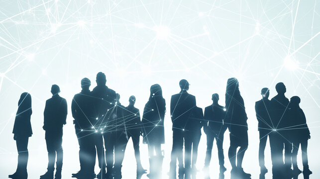 Composited visual of group of multinational people and communication network concept. Wide angle visual for banners or advertisements.