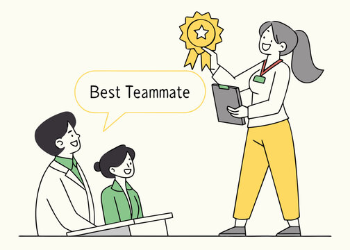Woman awards a gold medal for best teammate to a man and woman isolated on white background