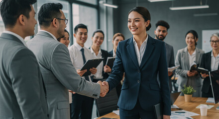 Group of business people exchanging handshakes in office setting, suitable for business communications, partnerships, teamwork concepts in corporate presentations.