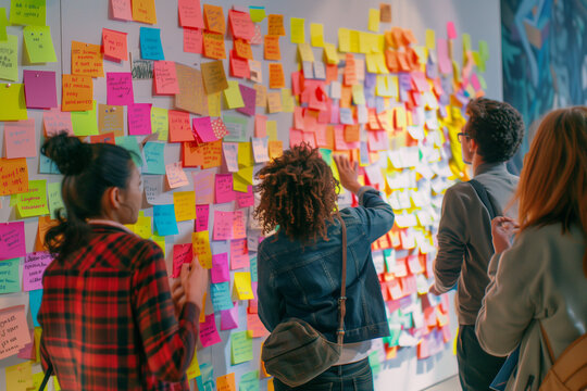 portrait-style photo featuring a diverse group of team members standing around a wall covered in colorful sticky notes, each contributing their ideas. The vibrant and dynamic atmos